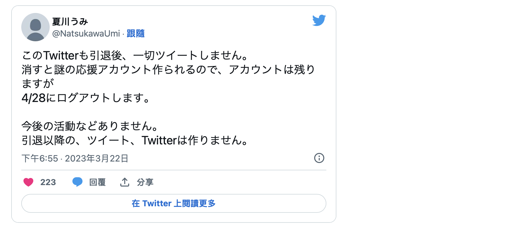 4/28完全引退!夏川うみ(夏川海)不删社群的理由是?