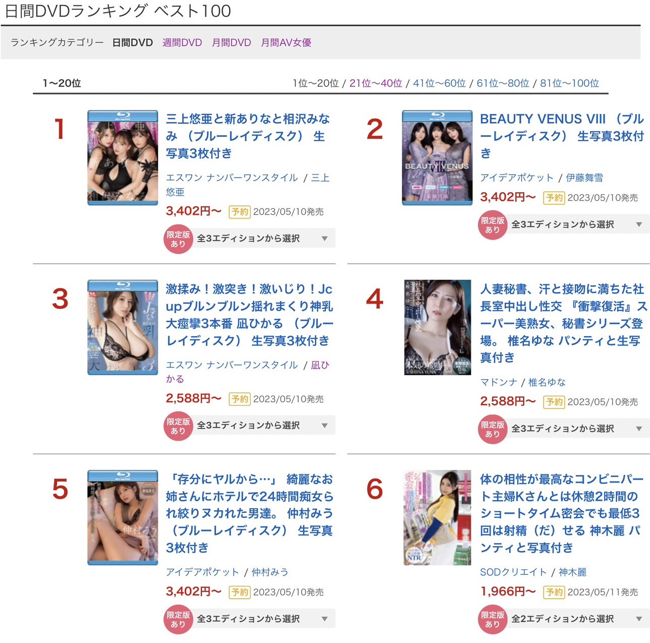 这是昨天FANZA的实体DVD排行榜。