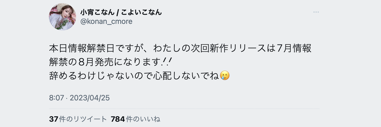 不过别担心,小宵こなん(小宵虎南)没有引退、只是作品会迟到!