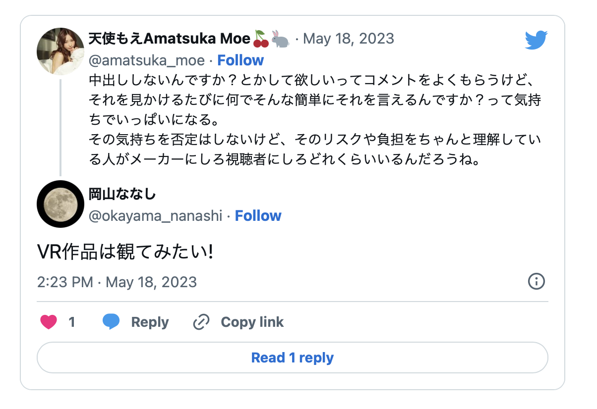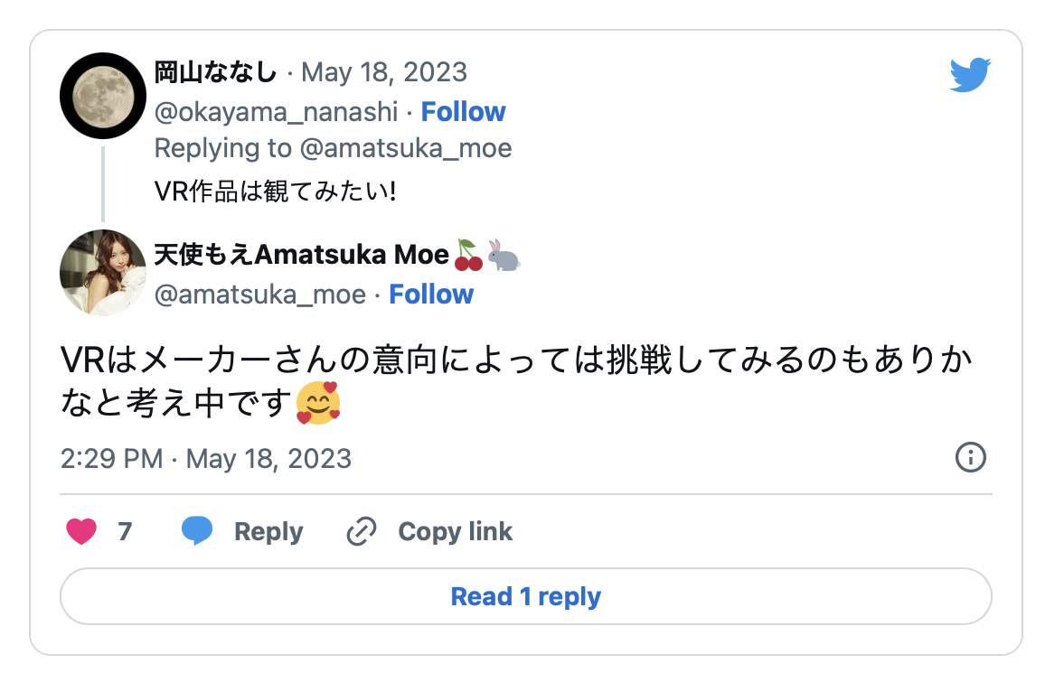 所以日本的AV情报站都以「朗报」来报导天使もえ(天使萌)的反应,不过也容我提醒大家,天使もえ(天使萌)所属的片商FALENO STAR上一支VR片是2021年9月的事了,天使もえ(天使萌)是真的球来我就打还是知道FALENO STAR不会拍VR片所以有恃无恐就看大家怎么想了⋯