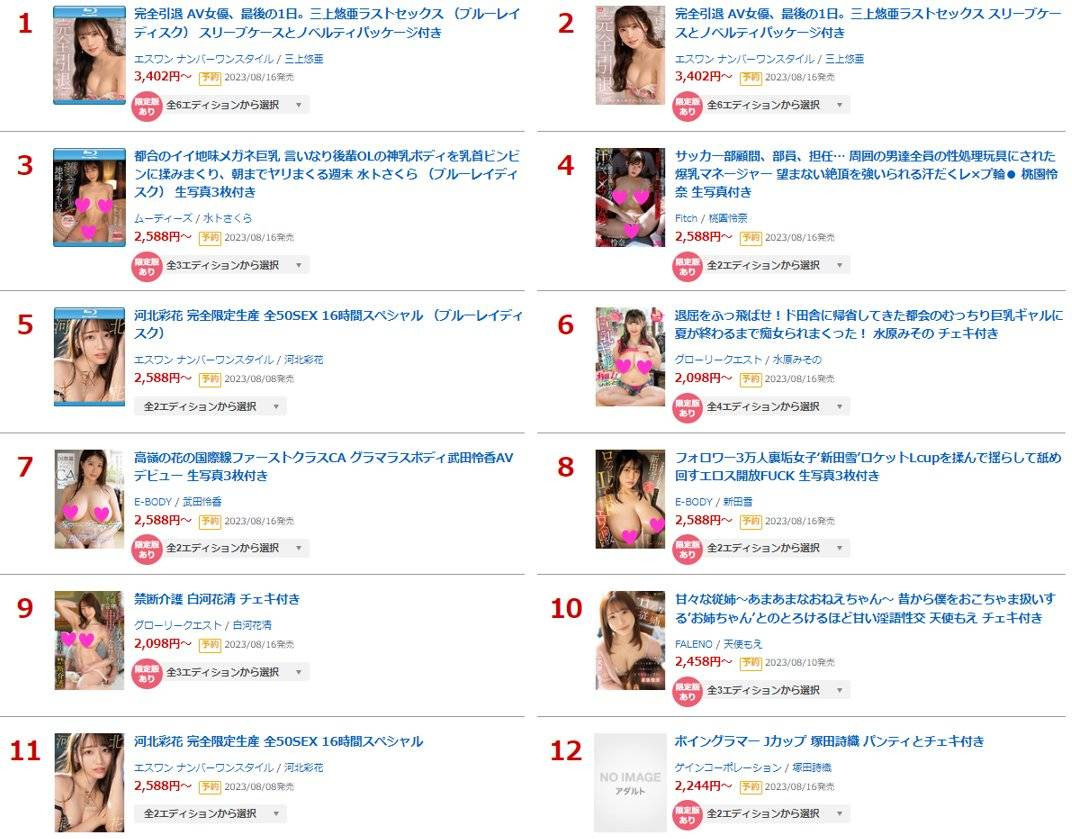 干,这还有什么好猜的?当然是发表引退作的「三上悠亜」,甚至可以这么说,假如她没拿到第一的话那S1上从导演下到作品企划通通都要土下座谢罪;除此之外呢?首先,河北彩花是真的超强,很多女优是发新片力争上游,她却只用精选辑就把大家打爆,蓝光第5加上DVD第11的成绩看似还好,但别忘了她并不是这一档发片的人喔,这成绩应该会让很多女优怀疑人生;再来,水卜さくら(水卜樱)和桃园怜奈还是很稳定,E-Body的新人则是最成功⋯