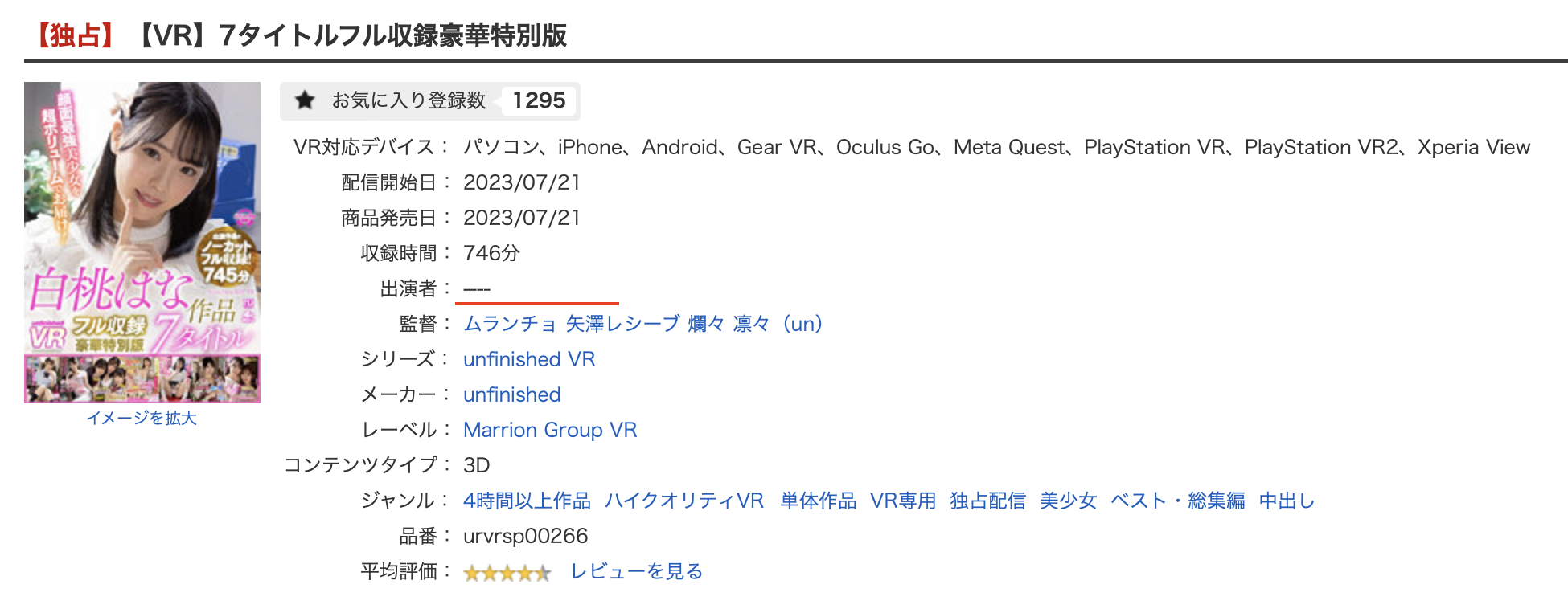 因为,她不只把twitter的ID改了后来还删帐号,现在还悄悄地把作品删掉自己的名字,请大家看看这支VR片,明明封面上写白桃はな(白桃花)的名字,但演出者的部分却变成了「——」: