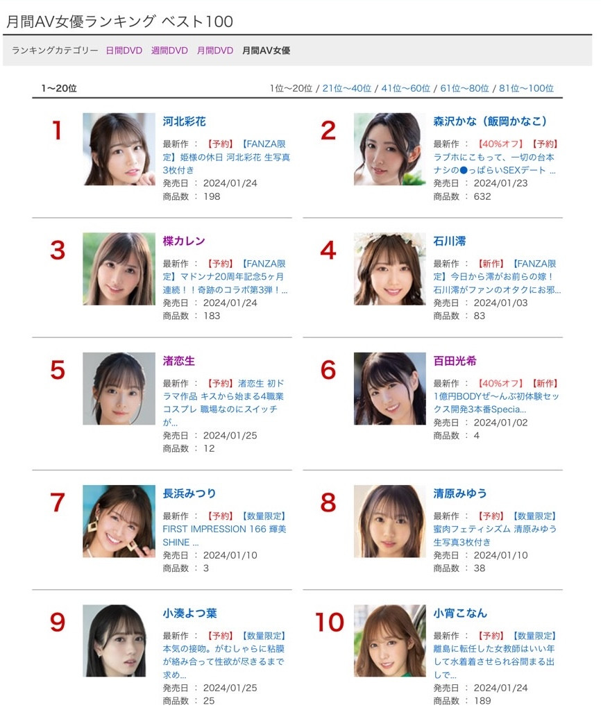 然后来看累积销售的的月间AV女优排行榜,第一名不意外的是河北彩花,因为她写真拿第一,新片排在第七,加起来肯定很吓人,再一次君临天下只是刚好;比较值得注意的是第二名「森沢かな(森泽佳奈)」,没错,一如上次排行榜公布时在下所说的,在松本いちか(松本一香)转职去当专属女优后,出道11年的她就是目前AV界最强的发片机器!