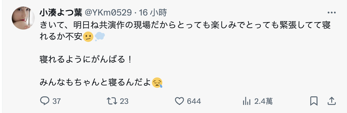 这个可能就是问题所在,星乃莉子可能是在拍片的时候出了什么差错导致她非常沮丧,我看到这两篇发文的时候直觉她是在SOD STAR大共演有了状况,但看了小凑よつ叶(小凑四叶)的X(https://x.com/YKm0529)她却说共演是在今天拍(16小时前的明日自然是就9月23日的今天),虽然片商拍共演片一定大多都是2-3天的作业,不过光凭小凑的这个线索还不能证实星乃是在共演的时候崩溃…