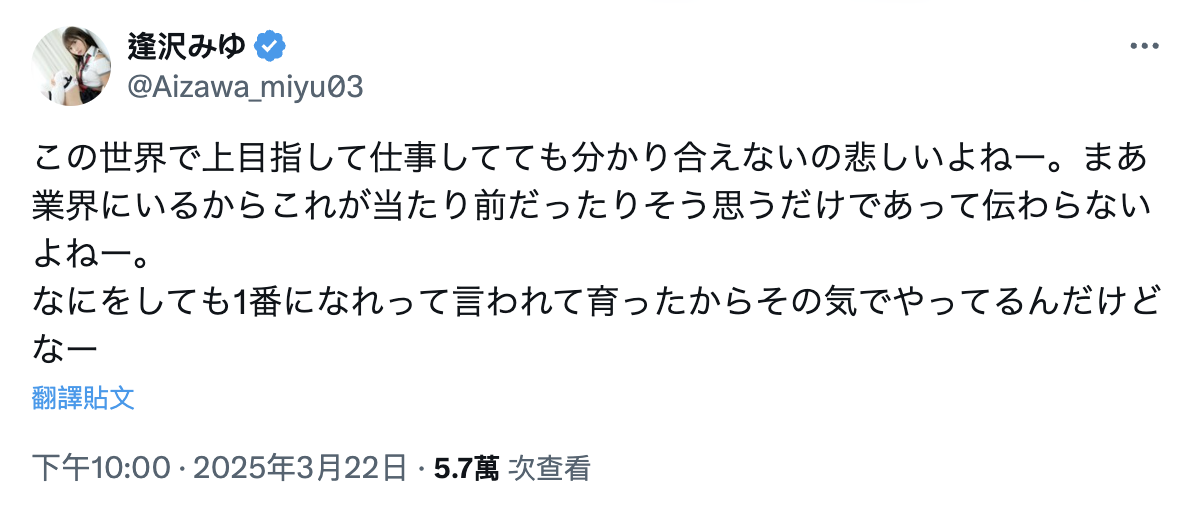 也很难讲,父母向来是AV女优这个工作最大的难关,虽然逢沢みゆ(逢泽美优)说了,虽然工作环境是一个很难被外界理解的世界,但从小被教育「不管做什么都要成为第一」的她可是抱着决心努力向前的,绝对不会放弃;不过你我都是人生父母养,都知道为人子女,就算长大了,要不管父母的想法做自己喜欢的事并不是容易的事,尤其是漂漂亮亮的女孩子去拍A片⋯