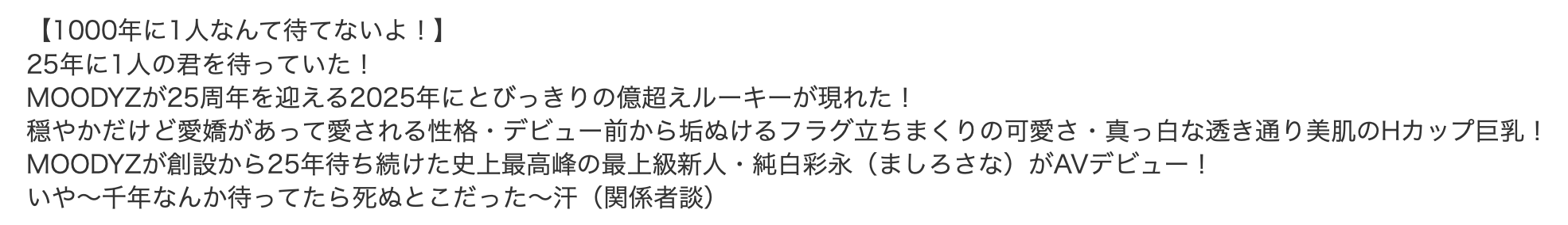 还记得我之前请大家去追踪的「纯白彩永」吗?今天,她正式开启神秘的面纱、以Moodyz独有女优的身分出道——然后我要坦白说,我她很重要,但知道我不这个新人有那么重要,有多重要呢?我们来看看Moodyz的文案是怎么形容她的: