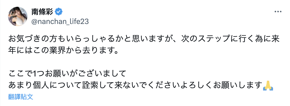 是的,就像标题说的,南条彩打算在明年的时候离开这个行,不干了~
