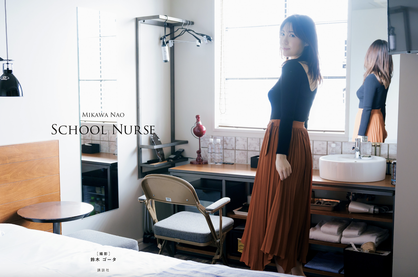 这是何方神圣呢?去年十月就有前辈叫我追踪她,说是即将出道的生力军,而看到她在週刊现代的写真我是觉得人设蛮有意思的ー美河ナオ(美河奈央)是个待在公立高中保健室上班的护士,170公分高F罩杯的她外型成熟美艳,让每个去保健室的学生都下面肿胀〜 不过话说回来,如此成熟美艳的她,会在哪一家片商出道?
