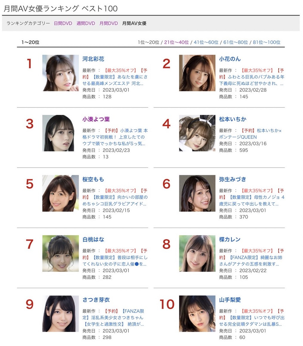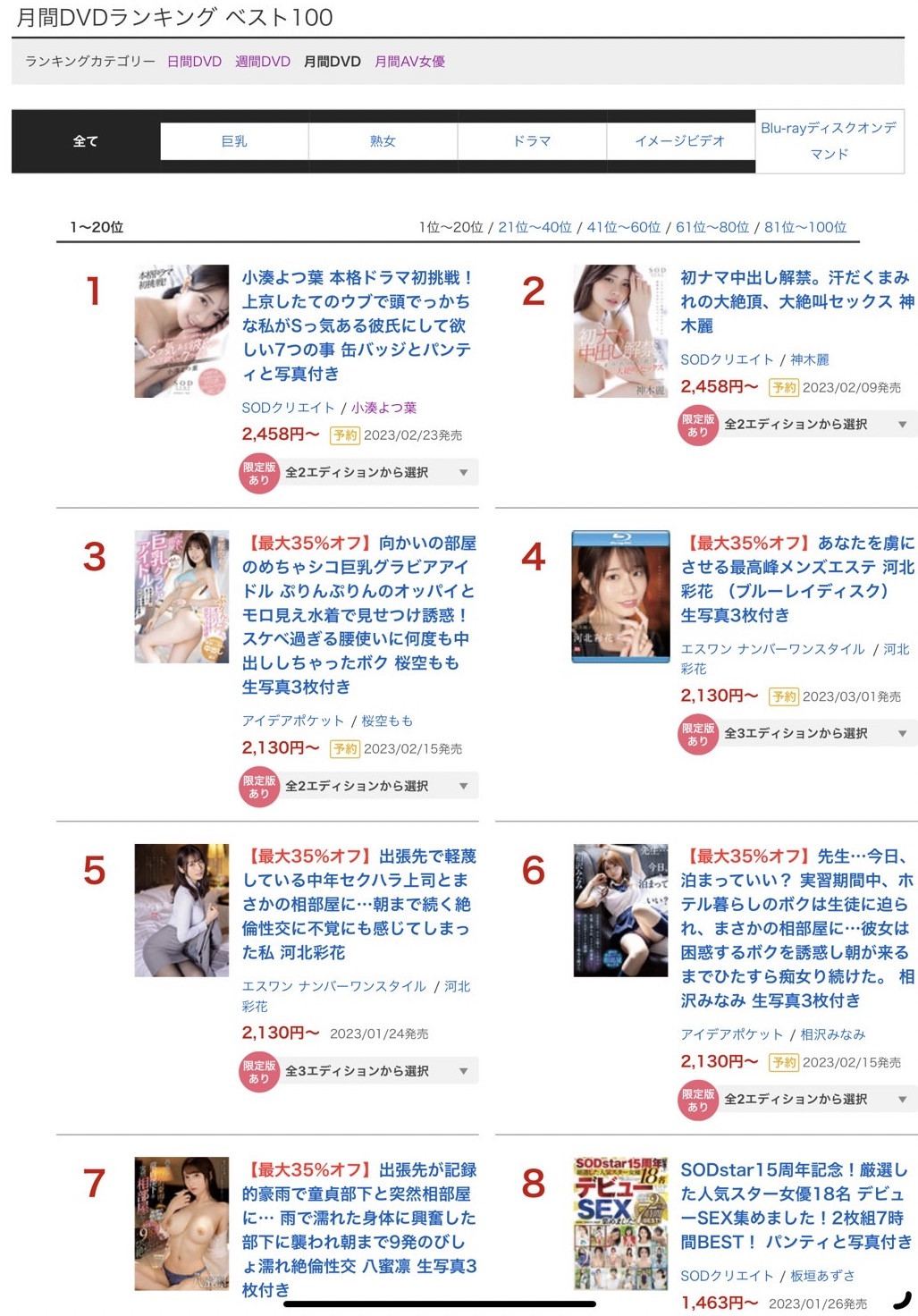 你会不会觉得怪怪的?我是不会啦,虽然2月新作「あなたを虏にさせる最高峰メンズエステ」预约成绩不佳(对河北彩花来说第4名就很差),不过她与武田大树合作的「出张先で軽蔑している中年セクハラ上司とまさかの相部屋に…朝まで続く絶伦性交に不覚にも感じてしまった私  」却因為有不少人过完新年假期才预约的缘故在上个月的销售排行榜卖得吓吓叫(DVD榜第5,蓝光榜19),加起来又把她拉到了第一: