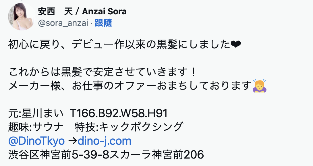 直接来翻这篇发文好了:从现在开始,我将要受事务所Dino照顾了并且改名为「安西天」,从星川まい(星川舞)时代就支持小妹我的粉丝和片商,让我们一起为了成为最顶尖的女优而努力吧〜