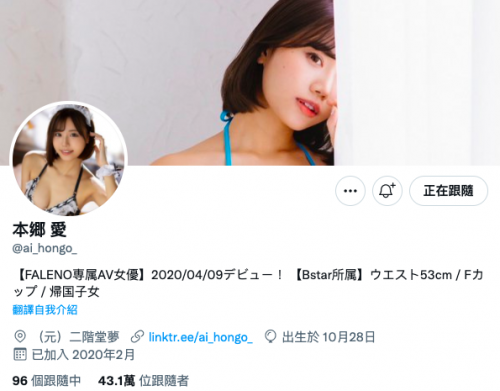 谁最具冠军相?这种人气投票要看的就是女优的号召力,所以谁的社群力量强就占优势,以twitter追踪数来看是本乡爱(二阶堂)独走,她的twitter有超过43万的追踪,而浜崎真绪、枢木あおい(枢木葵)和藤森里穂则是都有超过20万的追踪是第二领先集团,就看看谁的铁粉多了:
