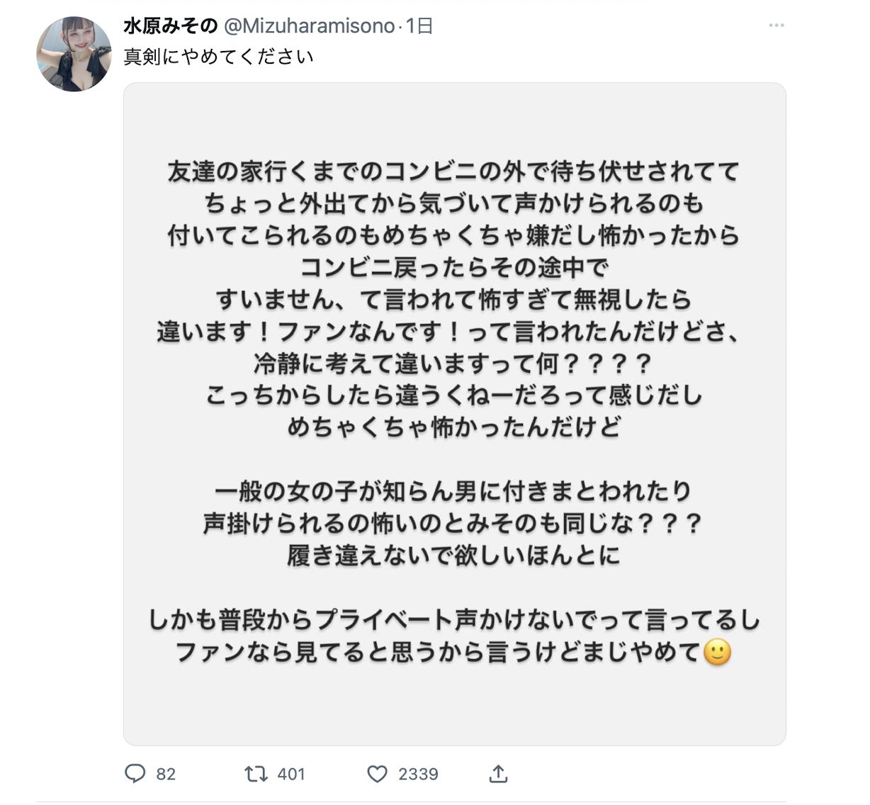 所以水原みその(水原美园)转头过去给那位「粉丝」回眸一笑?不,才没有,水原みその(水原美园)是以「愤慨」来形容自己的感受:「对一般女孩子来说,被陌生男性跟踪或搭讪都很恐怖吧?」但如果那男人真的是粉丝呢?水原强周自己已经讲过很多遍:「活动的时候非常欢迎大家来交流,但其他时候请给我私人的空间,相信粉丝都明白这道理吧?为什么会有人觉得大半夜地搭讪没什么大不了?」