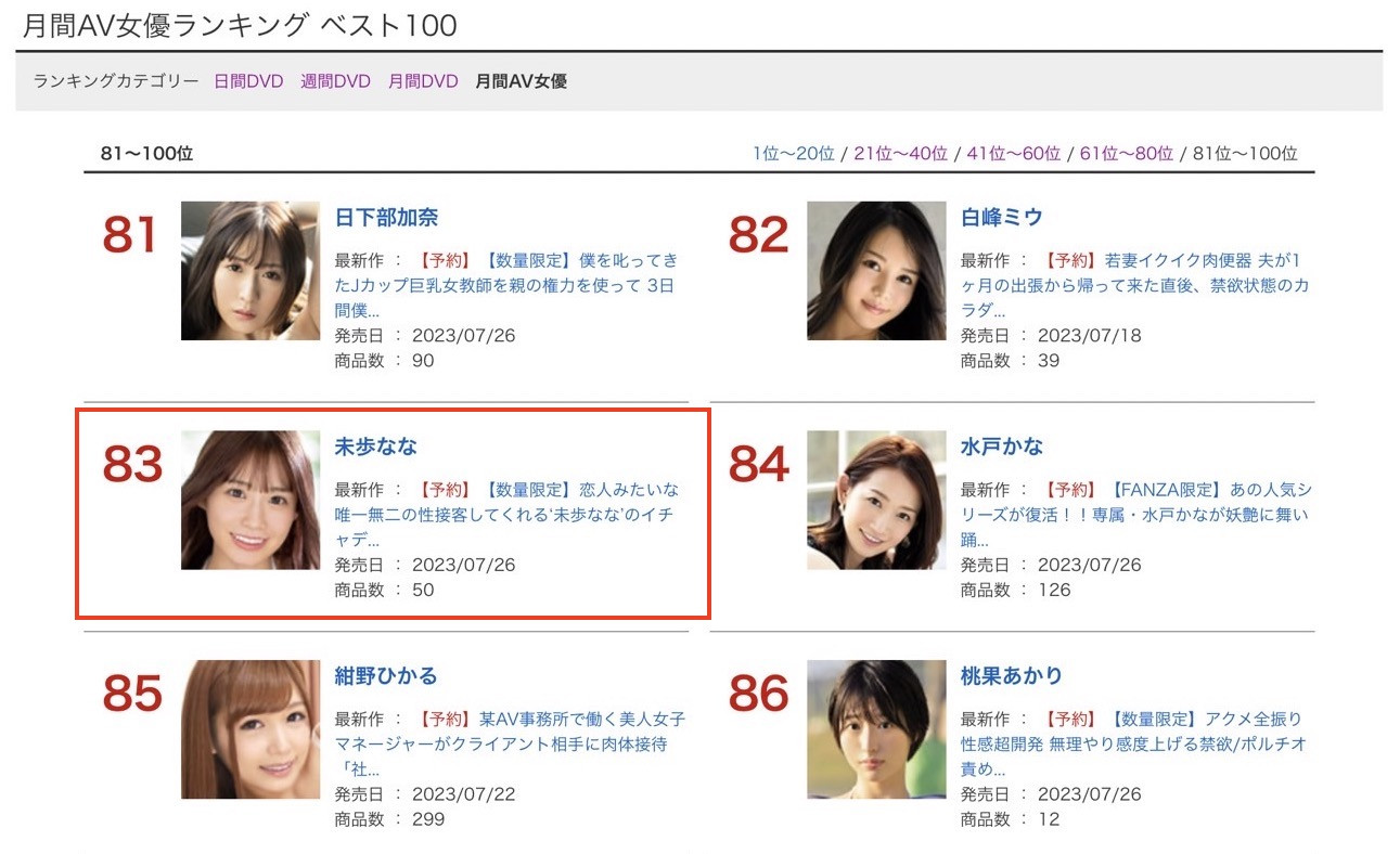 坦白说,她确实还没到最优秀的境界,最多人参考FANZA月排行榜她新片没进榜,总销售的AV女优排行榜则是排在83;周排行榜她的名次比较高,新作「恋人みたいな唯一无二の性接客してくれる“未歩なな”のイチャデレ风俗10店铺スペシャル」排在第27名,我想她之所以会有这感触应该是第一张合约已经走完了(专属12支作品),虽然继续待在S1的机会很大,但她并不满意自己的成绩⋯