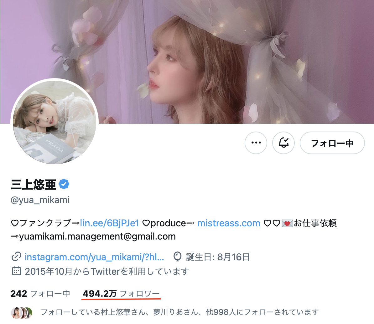 意思就是把她所有社群的追踪数加起来看是多少,这种状况通常不会出现在最顶级的女优如三上悠亜和深田えいみ(深田咏美)身上,因为她们光是一个社群的追踪就吓死人了ー像三上光是twitter就有接近500万的追踪、深田えいみ(深田咏美)的twitter则有超过350万,这种就不必算什么总和了,因为大家都知道她们超强⋯