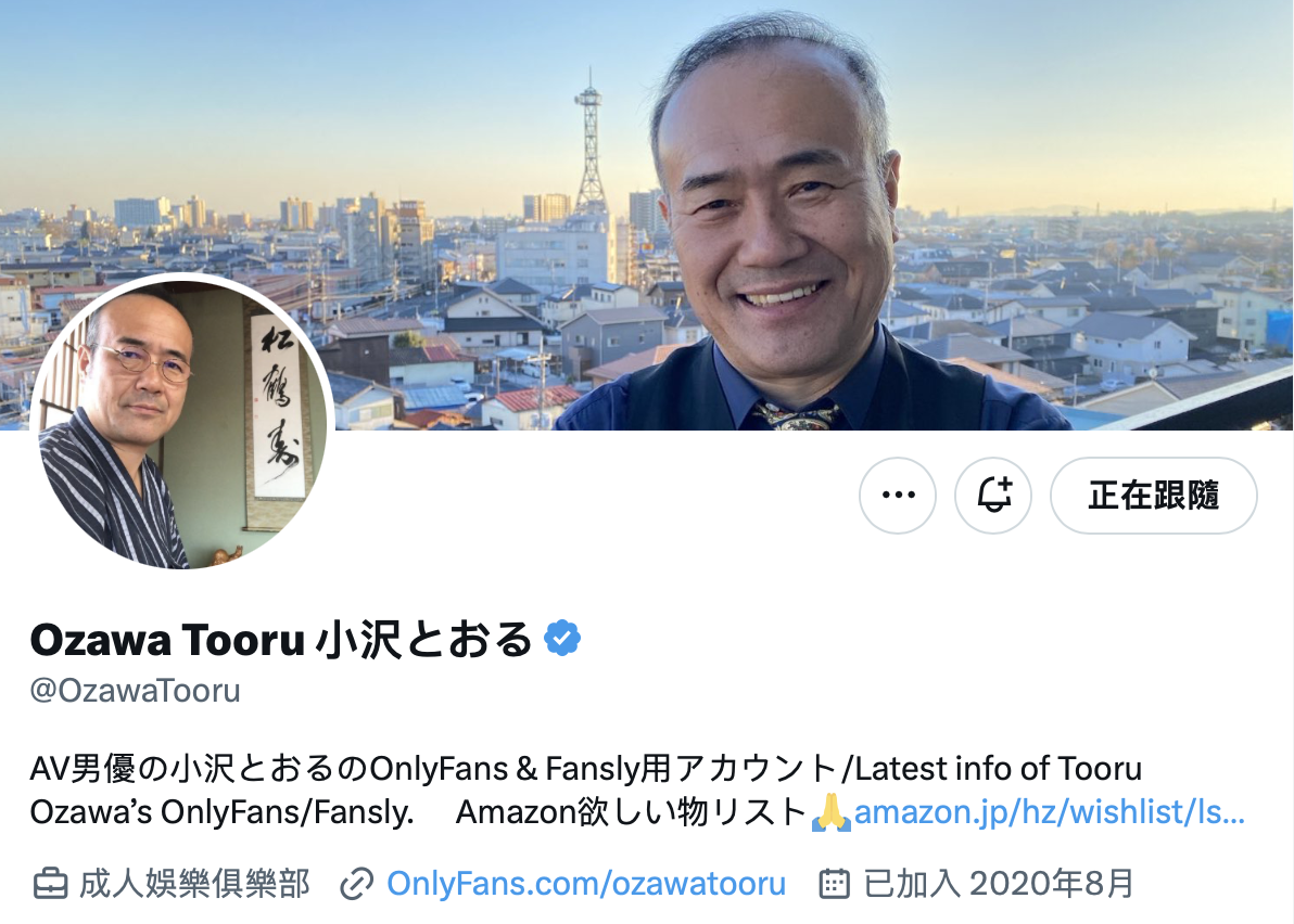 在现实生活中千万不要这样喔,不过在AV的世界里,我觉得小沢とおる(小泽彻)演社长比义父(丈夫的爸爸)更有说服力:一来是穿西装背心他还真有几分气势,二来他也真的有够会亲,看他一直亲一直亲让女优从恶心屈辱到后来被征服的模样我就觉得这男优应该是真的吻功了得,也难怪和其他男优不同,小沢とおる(小泽彻)不但在社群上蛮活跃的有大批追踪者,甚至还开了Amazon Wish List(就是Amazon的连结让你可以买礼物送他)以及可以订阅的OnlyFans: