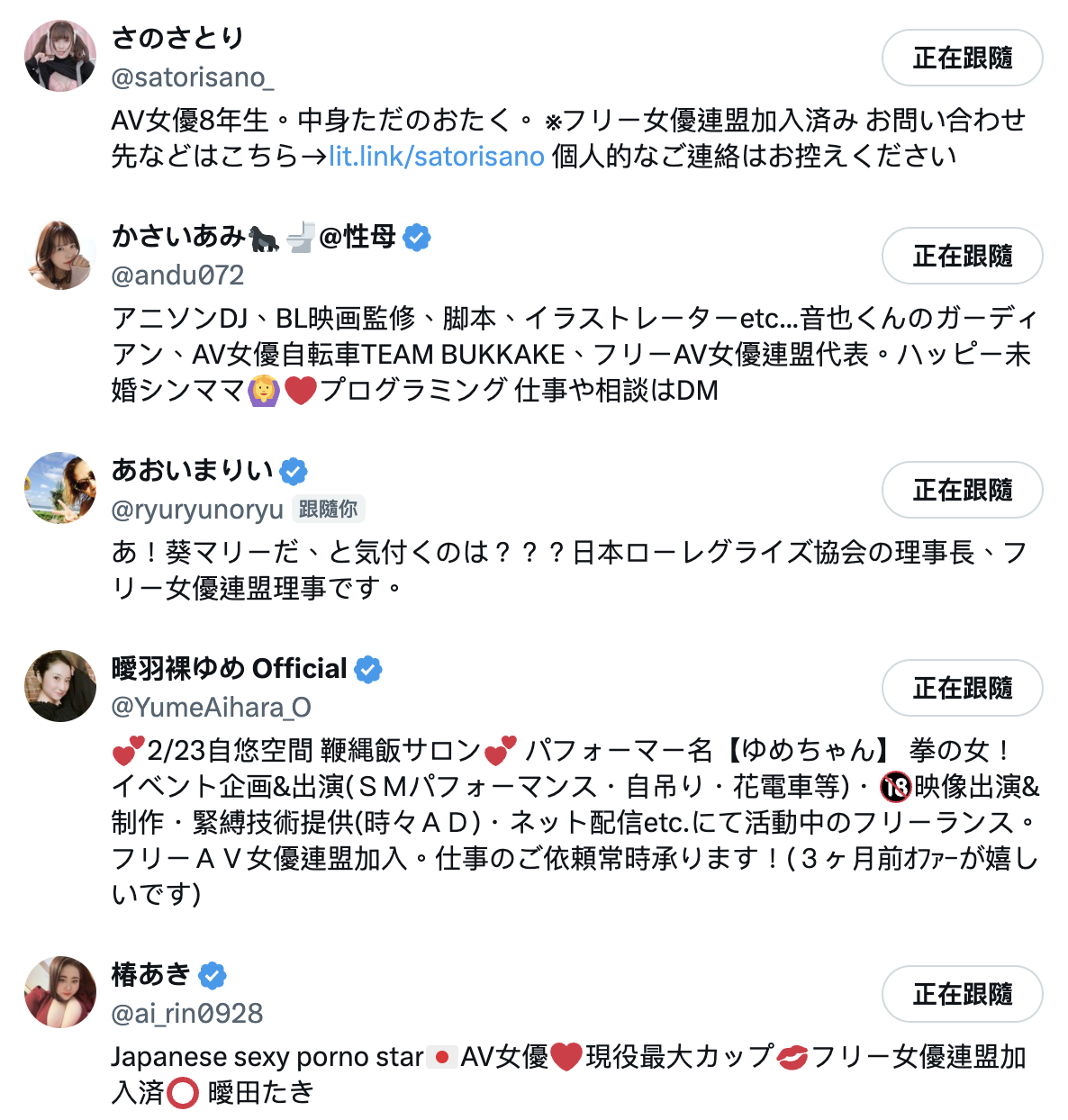 所以要加入这个フリー女优连盟(Free女优联盟)是有限制的,你必须在这一行要有五年以上的资历!