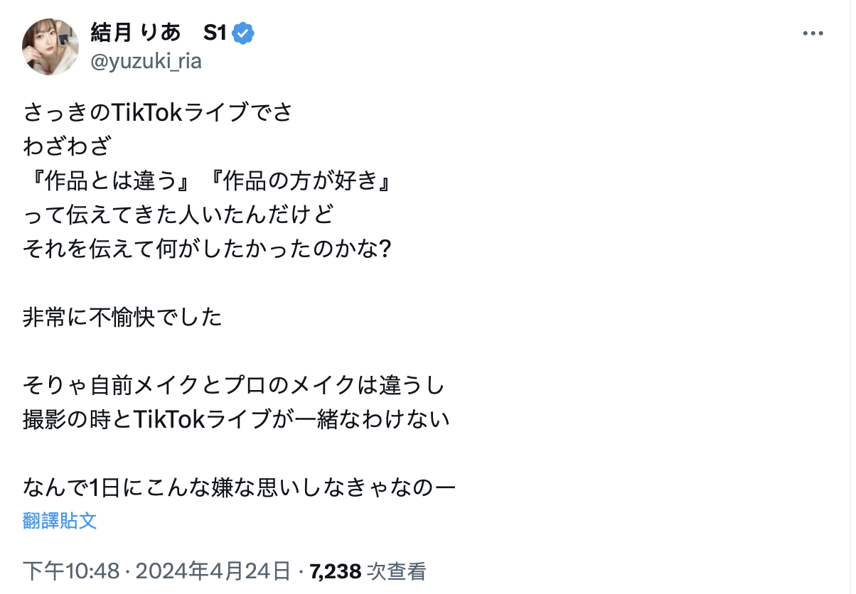 为什么怒?原来许久没有作品的她昨天在Tiktok直播,结果聊天室里出现了像是「作品とは违う(和作品长得不一样)」以及「作品の方が好き(比较喜欢你作品里的样子)」这样的留言,她愈看愈不开心愈想愈是火大,最后她留下了这么一句: