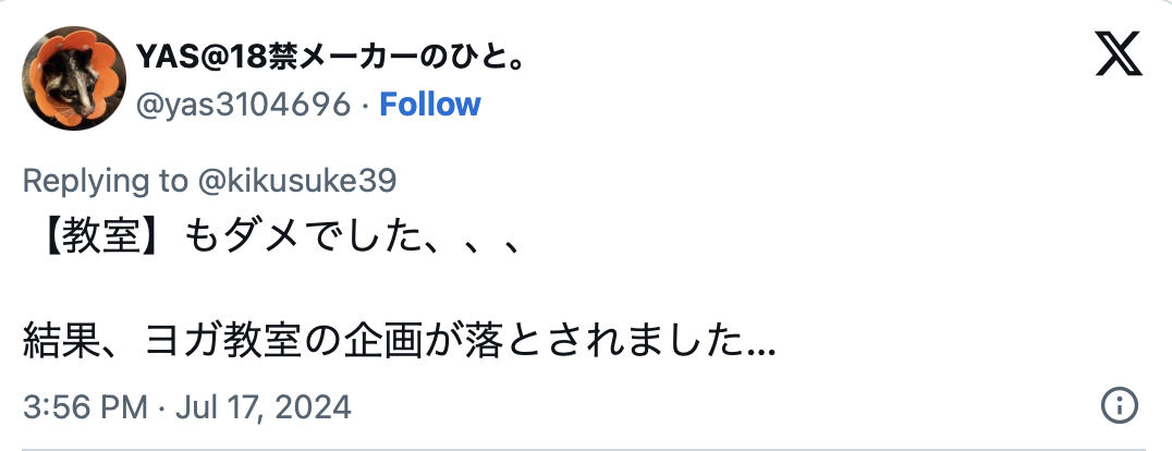 同样的状况也在另外一位「业界の人」的X出现,他说从现在开始,「教师」、「先生」和「学校」都成了禁语,然后另外一位在成人片商工作的YAS也发文说因为「教室」被列为禁语,所以「瑜伽教室」的企划就被放弃了⋯