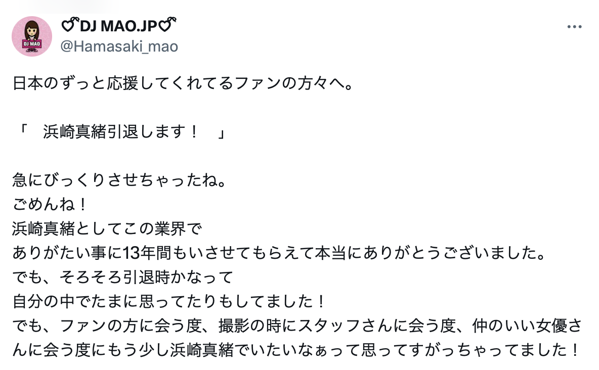 现场根本没时间问,更何况浜崎真绪也不是我们摊位的来宾,突然冲去问也蛮失礼的;不过还好,到了晚上她就在自己的X(https://x.com/Hamasaki_mao/)上说明了:她说能以浜崎真绪的名字在这一行待13年真的非常感谢大家支持,不过最近时不时地在想,好像是引退的时候了: