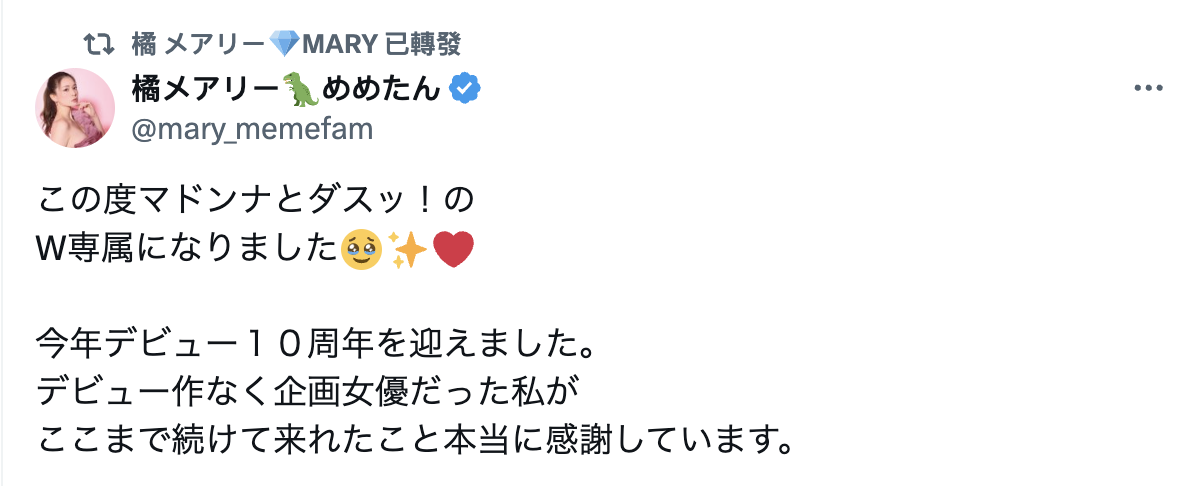 是的,没错,从9月开始,橘メアリー(橘玛丽)就不再是游走各片商的企划女优而是被片商框下来当专属女优惹;而且不是只有Madonna喔,橘メアリー(橘玛丽)有在自己的X上爆料(https://x.com/mary_tachibana),不只是Madonna,接下来她还会在ダスツ! (DAS)发片: