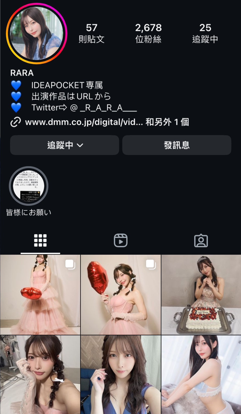 那要怎么办呢? RARA除了改经营IG(https://www.instagram.com/r_a_r_a__a/)外也特别在限动请大家帮忙向X官方反应让她能取回帐号;不过她的IG目前追踪很少还不到3000人,宣传效果还是有限,应该还是会想办法恢复X的帐号〜