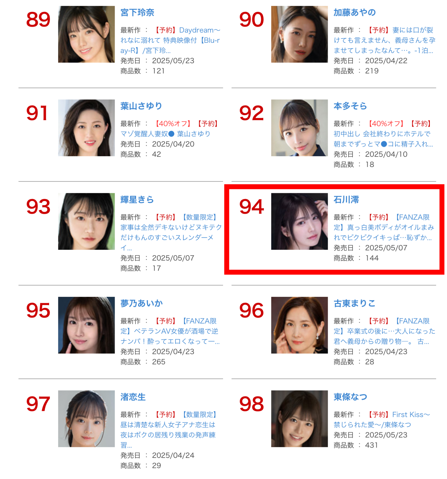 她的新作「えっちぃコソ练してみる?お节介な幼驯染みの澪は早漏体质なのにボクを如何to育精”这次排行第18,珊瑚她最近卖得比较不好的作品,不过奇怪的事情来了,看到我们河北彩伽作品销售排行第五然后累计销售的月间AV女优排行榜高居第二,但我们怎么退出now直播账号找到就是找不到石川澪,你以为FANZA把她自己好好地忘记了她的存在吗?没有喔,你要拉到最后一页,才会在累积销量的月间AV女优排行榜石川澪「只有」第94名,勉强进榜…