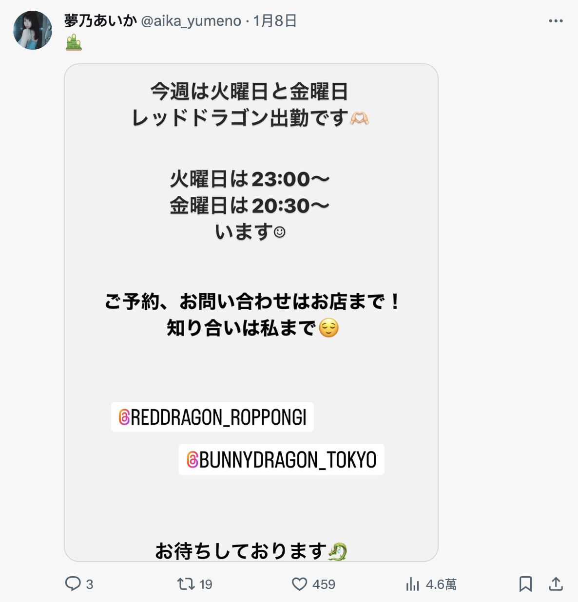 既然如此为什么没有新片呢?这大概分两方面,首先,梦乃あいか(梦乃爱华)的工作重心有所转移,1月12日的时候她就有在六本木的全AV女优陪酒酒吧Red Dragon(红龙,レッドドラゴン)报班,然后刚刚提到她还是会更新社群对吧?有在看的朋友就知道梦乃あいか(梦乃爱华)现在发文都是撒娇叫大家去找她;再来,现在AV新法的时代,女优如果想休息那片商和事务所都只能配合,再加上梦乃不只是S1最资深的女优也是事务所的大姐大,她说想休息,谁都不能押着她去〜