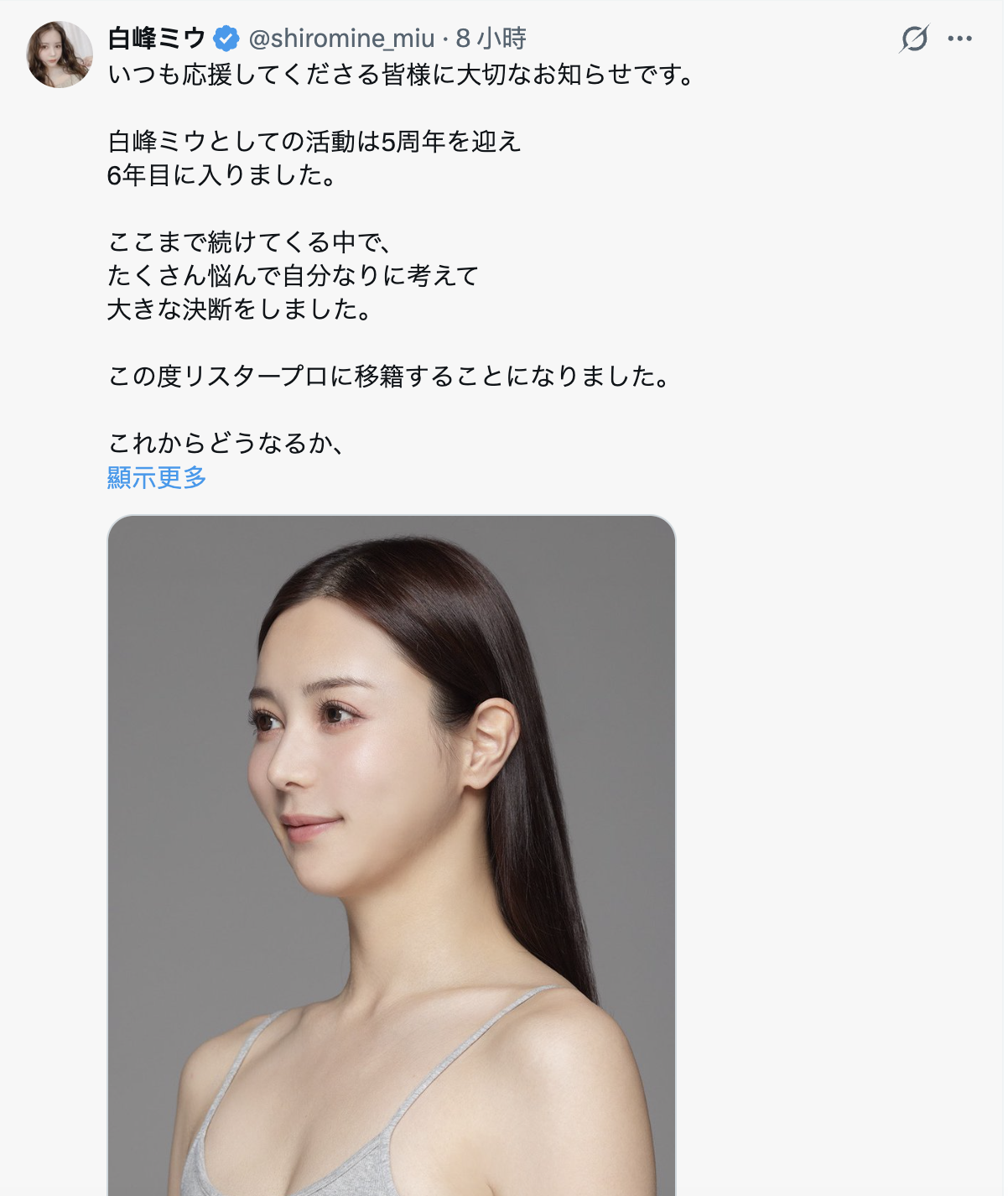 别担心,不是引退,白峰ミウ(白峰美羽)在喜迎出道五周年的同时宣布自己更换经纪公司,从原来的ジュンプロ(Jun Pro)变成了リスタープロ(LiStarPro):